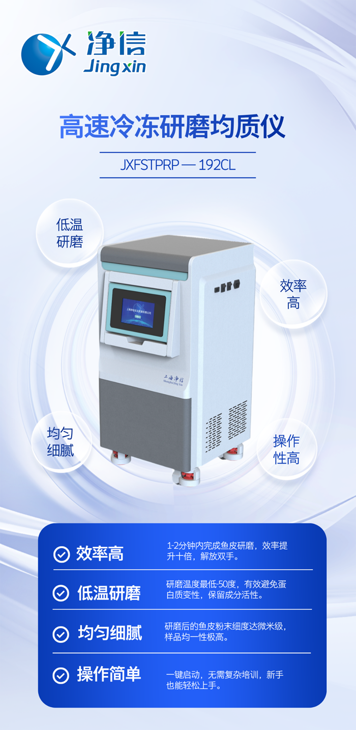 實(shí)驗(yàn)背景:魚(yú)皮中富含膠原蛋白等活性成分,是美容保健、功能食品研發(fā)的熱門(mén)原料。但在實(shí)驗(yàn)分析前,常需將魚(yú)皮研磨成均勻細(xì)粉,選對(duì)儀器,實(shí)驗(yàn)事半功倍。凈信高速冷凍研磨均質(zhì)儀助您輕松解決研磨問(wèn)題!