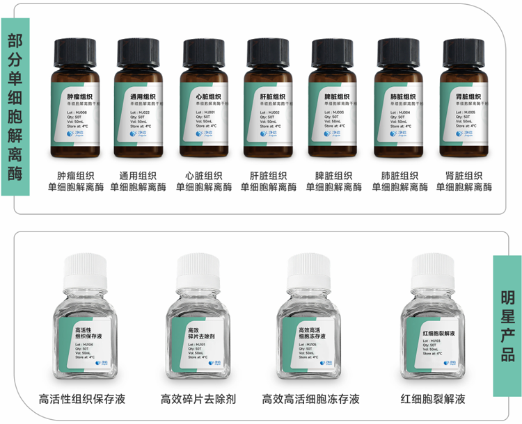 上海凈信推出了一系列針對(duì)不同組織的特異性單細(xì)胞解離酶,專(zhuān)為高質(zhì)量單細(xì)胞懸液制備而設(shè)計(jì)。產(chǎn)品采用了高純度、多元化酶配方,可快速、溫和解離組織樣本,最大限度保持細(xì)胞活性和完整性,適用于各類(lèi)原代細(xì)胞提取、培養(yǎng)、流式分析、類(lèi)器官、腫瘤組織解離及單細(xì)胞測(cè)序等研究。